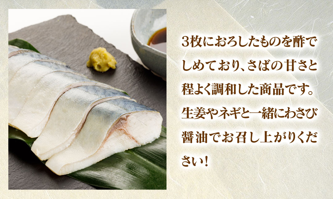 3枚におろしたものを酢でしめており、さばの甘さと程よく調和した商品です。