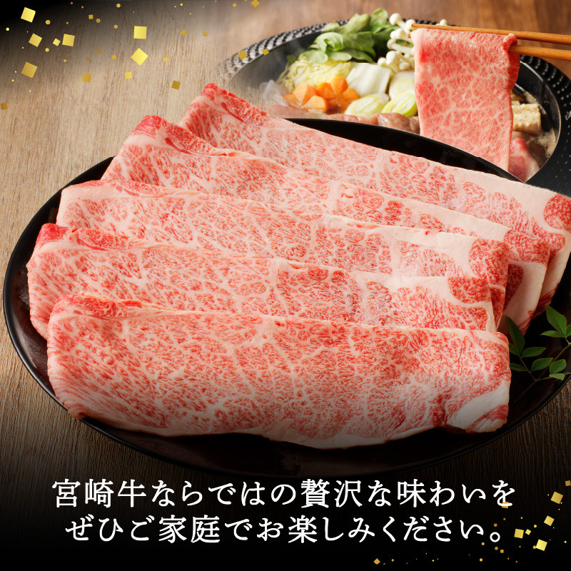 宮崎牛(みやざきうし、みやざきぎゅう)とは、宮崎県内で生産肥育された黒毛和種のうち日本食肉格付協会の格付において肉質等級4等級以上の牛肉です。 宮崎県の地域ブランドの一つであり、地域団体商標に登録されており、最高級の牛肉であることが証明されております。 また、5年に1度開催されている和牛オリンピックで、内閣総理大臣賞を4連続で受賞するなど、ブランド牛としても、国内外で高く支持されています。 宮崎牛の特徴は、なんといっても口に入れた瞬間にとろける上質な霜降りです。 赤身とのバランスも良く、柔らかくて、ジューシーな味わいが自慢です。 その宮崎牛をすき焼き用にスライスして、更に食べ比べが出来るように4種セットにしてお届けします。 この機会に宮崎県が誇る宮崎牛のすき焼き4種を食べ比べてみてください。