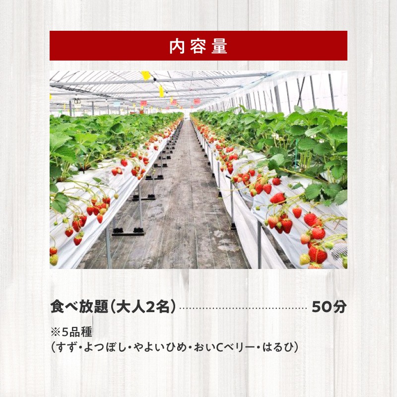 | 容量 | 内容:5品種(すず・よつぼし・やよいひめ・おいCベリー・はるひ) 時間:50分食べ放題 使用期間:3月31日まで 人数:大人2名 |