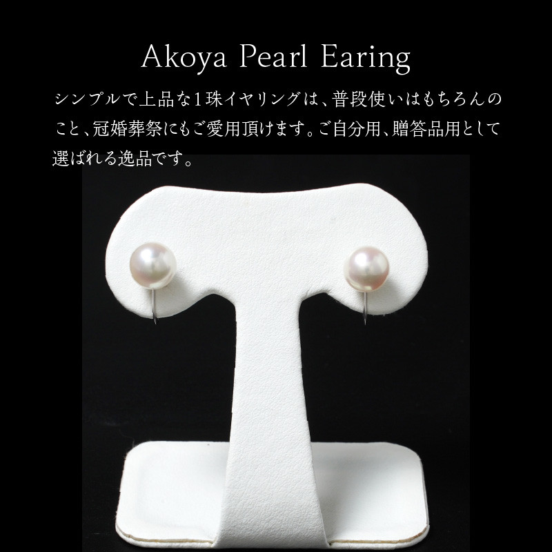宝石鑑定士の確かな目で選んだ、約8.0mm良質なあこや本真珠です。 イヤリング金具は14金ホワイトゴールドのネジ式を採用。 K14ホワイトゴールドは変形しにくいので安心です。 ピアスはよく販売されているけど、イヤリングがなかなか見つからない。そんな方にオススメします。 シンプルで上品なパール1珠イヤリングは、普段使いはもちろんのこと、冠婚葬祭にもご愛用頂けます。 8.0mmの存在感は大人の女性を感じさせるボリュームがあります。 自分用、贈答品用として選ばれる逸品です。 ジュエリーケースと、経年劣化防止に真珠クロスをお付け致します。 【注意事項】 ・画像はイメージです。 ・製品の特性上、色や輝きが写真と異なる場合や、天然の養殖真珠のため特有の小傷やエクボ(凹み等)がございます。ご理解ご了承の上、お申し込みをお願いいたします。 ・真珠と金属を接合した際に、製造工程上、接着痕が白化したような痕が装着時に見えない箇所にできることがありますが、これは品質の劣化ではなく、製品上の問題はありません。ご理解のほど、よろしくお願いいたします。 ・贈答品用でラッピング希望の場合は、備考欄に「ラッピング希望」とご記入ください。