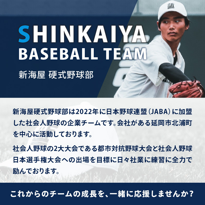 新海屋硬式野球部は2022年に日本野球連盟(JABA)に加盟した社会人野球の企業チームです。