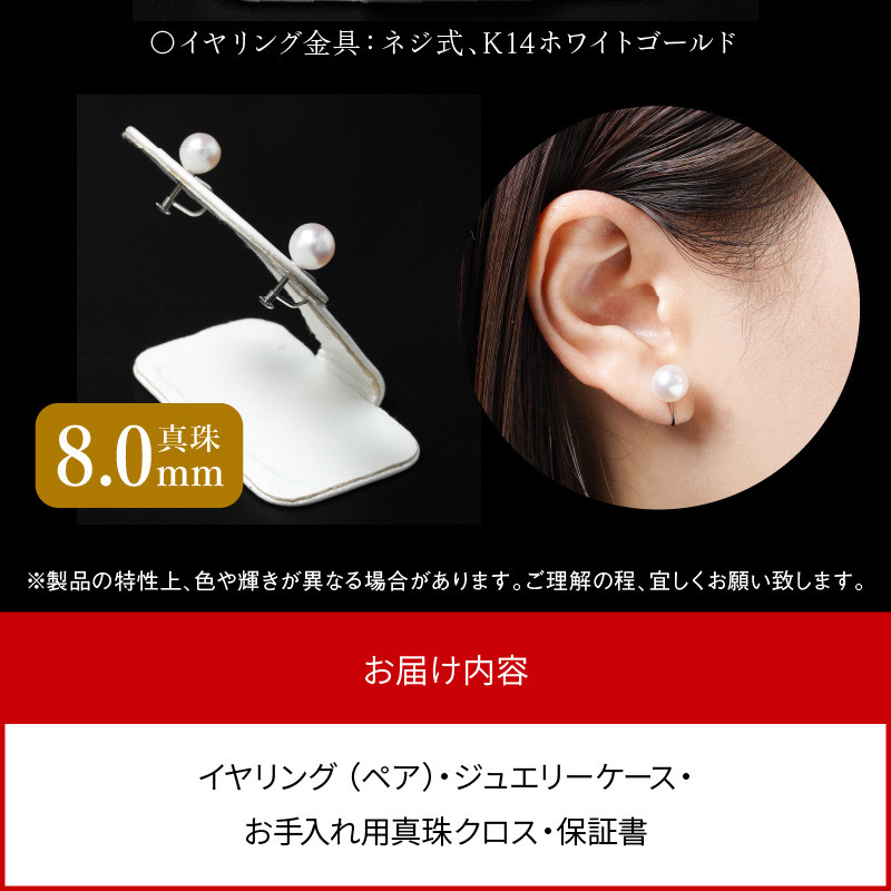 宝石鑑定士の確かな目で選んだ、約8.0mm良質なあこや本真珠です。 イヤリング金具は14金ホワイトゴールドのネジ式を採用。 K14ホワイトゴールドは変形しにくいので安心です。 ピアスはよく販売されているけど、イヤリングがなかなか見つからない。そんな方にオススメします。 シンプルで上品なパール1珠イヤリングは、普段使いはもちろんのこと、冠婚葬祭にもご愛用頂けます。 8.0mmの存在感は大人の女性を感じさせるボリュームがあります。 自分用、贈答品用として選ばれる逸品です。 ジュエリーケースと、経年劣化防止に真珠クロスをお付け致します。 【注意事項】 ・画像はイメージです。 ・製品の特性上、色や輝きが写真と異なる場合や、天然の養殖真珠のため特有の小傷やエクボ(凹み等)がございます。ご理解ご了承の上、お申し込みをお願いいたします。 ・真珠と金属を接合した際に、製造工程上、接着痕が白化したような痕が装着時に見えない箇所にできることがありますが、これは品質の劣化ではなく、製品上の問題はありません。ご理解のほど、よろしくお願いいたします。 ・贈答品用でラッピング希望の場合は、備考欄に「ラッピング希望」とご記入ください。