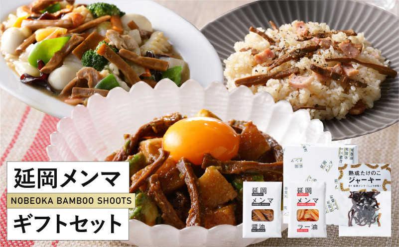 延岡メンマ(醤油、ラー油)、 熟成たけのこジャーキーのセットです。 こだわりの味付けにて和洋中のどのお料理とも相性良く仕上げました。