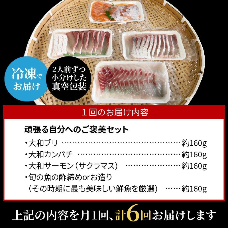 | 容量 | ・大和ブリ:約160g ・大和カンパチ:約160g ・大和サーモン(サクラマス):約160g ・旬の魚の酢締めorお造り(その時期に最も美味しい鮮魚を厳選):約160g 上記を毎月1回、計6ヶ月お届けします。 |