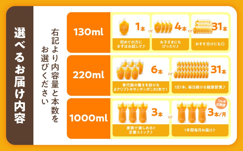 | 容量 | 【サイズ・本数が選べる!!】 まる搾りみかんジュース 130ml:1本、4本、31本 220ml:6本、31本 1000ml:3本、3本×12か月定期便 |