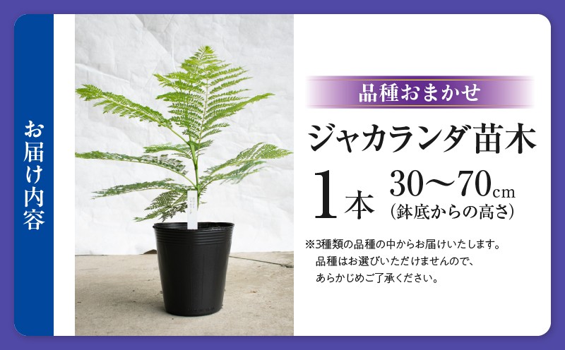 | 容量 | 【1本】 ジャカランダ苗木 ※品種おまかせ 30~70cm(鉢底からの高さ) |