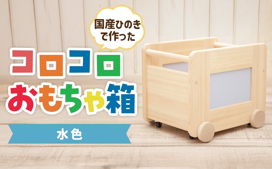国産ひのきで作った、シンプルで可愛らしいデザインのおもちゃ箱です! コロコロおもちゃ箱<水色:川﨑クラフト>