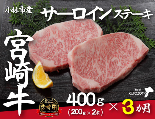 宮崎牛、サーロイン、限定、定期便、ステーキ、A4等級以上、焼肉、内閣総理大臣賞 【定期便・全3回】小林市産宮崎牛特選サーロインステーキコース(200g×2枚×3ヶ月)(国産 牛肉 国産牛 和牛 黒毛和牛 赤身 サーロイン ステーキ 焼肉)