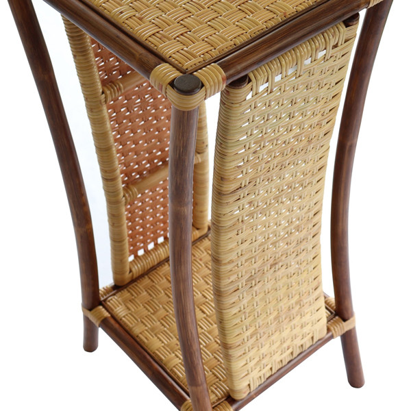 また、上下の天板は市松編みでピンと張り、籐家具・籐製品としての風格をより一層感じる事が出来ます。高さがありながらも、4本脚で安定感があり、重量のある花瓶なども安心して置くことが出来ます。玄関やリビングの花台、また電話台として、更にはキッチンカウンターなどのちょっとしたサイドテーブルにもお使い頂けそう。