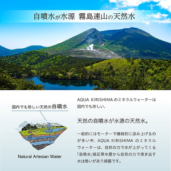 その結果、アクアキリシマは、シリカ、マグネシウム、炭酸水素イオンなどの天然ミネラルを豊富に含んだ中硬水となります。