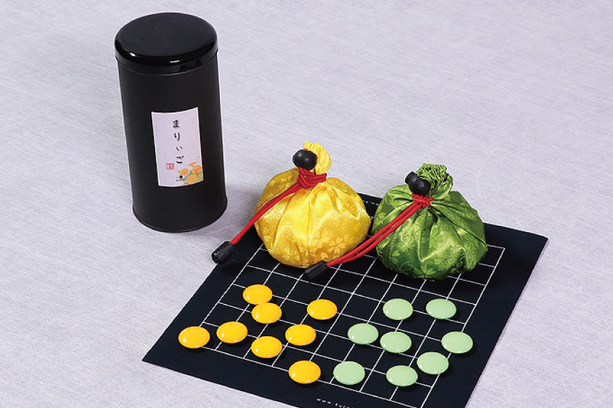 黄色やオレンジの花を咲かせる『マリーゴールド』をモチーフにデザインしたと黄色の蛤碁石と藍色の布製碁盤のセットです。