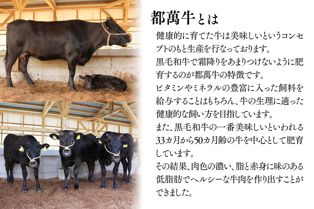 都萬牛とは従来の黒毛和牛とは異なり、霜降りをあまり入れないようにビタミン、ミネラルを豊富に含んだ飼料を多給し、健康的に肥育した黒毛和牛です。