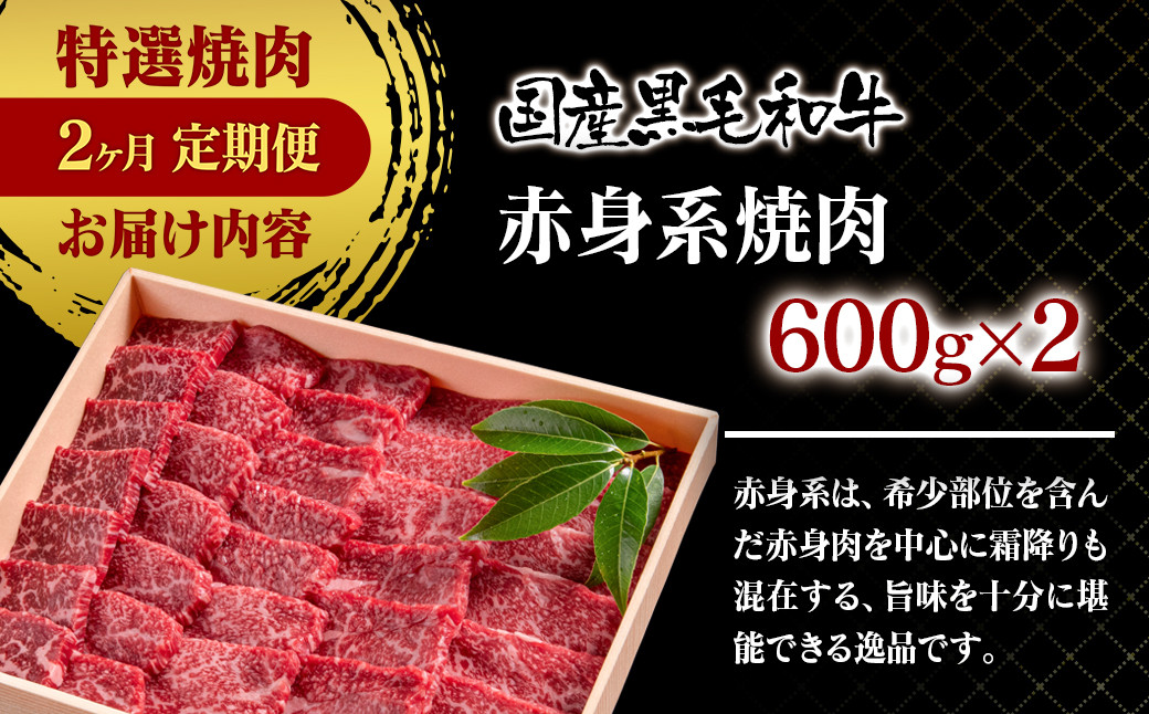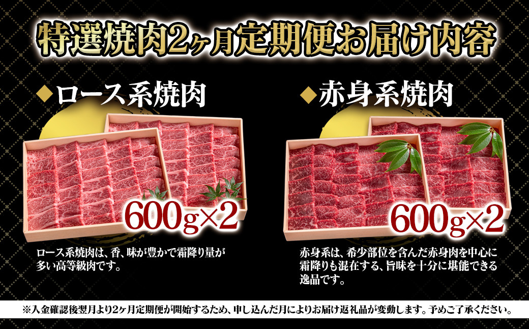 決済完了月の翌月発送開始になります。 お届けの2ヶ月間、各月下旬発送になります 1月.3月.5月.7月.9月発送開始 黒毛和牛特選ロース系焼肉:600g×2 2月.4月.6月.8月.10月発送開始 黒毛和牛特選赤身系焼肉:600g×2 |
