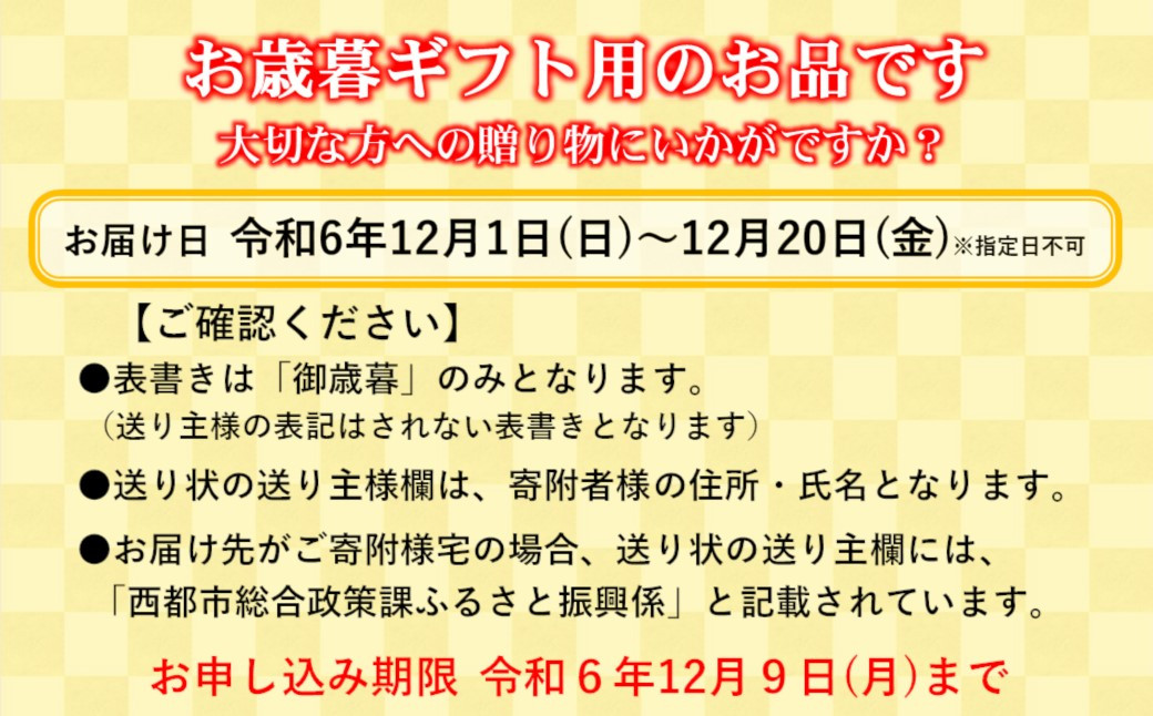 発送等には万全を期しておりますが、品質に不都合がございましたら画像を添付いただき、お手元の『返礼品を破棄せずに』お早めに西都市ふるさと納税(furusato@city.saito.lg.jp)までご連絡ください。