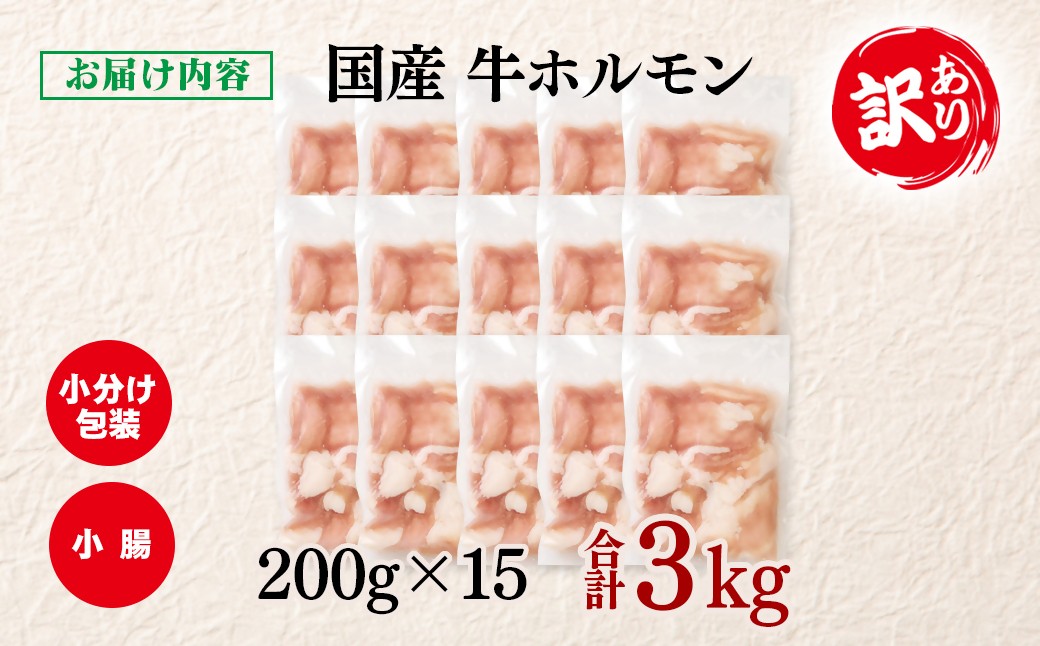 地域の生産者応援の品 訳あり牛ホルモン 小腸 3㎏ 小分け200g×15 国産 ホルモン もつ鍋 焼肉用 国産牛 牛モツ コラーゲン<2-111>