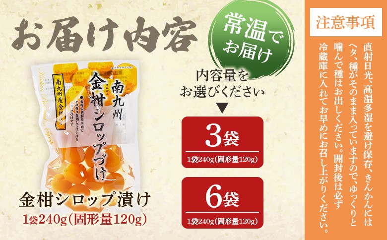宮崎県産金柑を、まるごと楽しむシロップ仕立て。 <金柑シロップ漬け 1袋240g(3袋/6袋)>選べる内容量 固形量120g 国産 宮崎県産金柑使用 きんかん キンカン 果実まるごと そのまま食べられる 冬の 乾燥 おせち料理 甘露煮 炭酸割 デザートお茶請け【MI724-ko_oya】【株式会社 上沖産業】