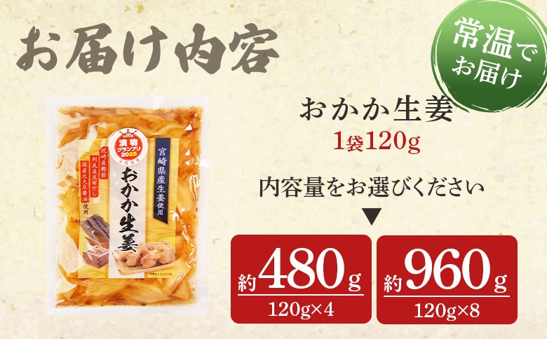 主原材は国産や地元のものを使用した、安全・安心なお漬物の詰め合わせをお届けします <おかか生姜 1袋120g(4袋計480g/8袋960g)>選べるセット内容量 国産野菜 宮崎県産 しょうが つけもの ご飯 朝ごはんのお供 おつまみ 和食 付け合わせ 万能おかず生姜 漬物グランプリ金賞 宮崎フードアワード優秀賞受賞【MI720-ko_oya】【株式会社 上沖産業】