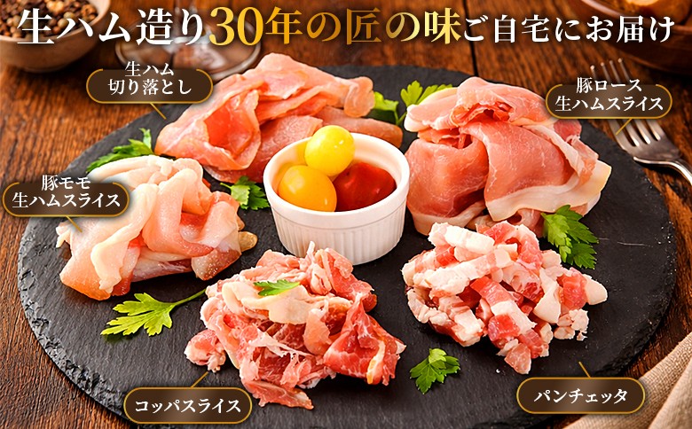 生ハム造り30年の匠の味!漬込みから丹精込めて手作り生ハムを製造しております。 <【訳あり】極みロース入り5種食べ比べセット生ハム>合計750g 国産 生ハム 豚モモ 豚ロース 豚肩ロース 豚バラ スライス コッパスライス パンチェッタ サラダ スープ パスタ 訳アリ ご家庭用 家庭用 セット 詰め合わせ 【MI735-pl】【株式会社プラス】