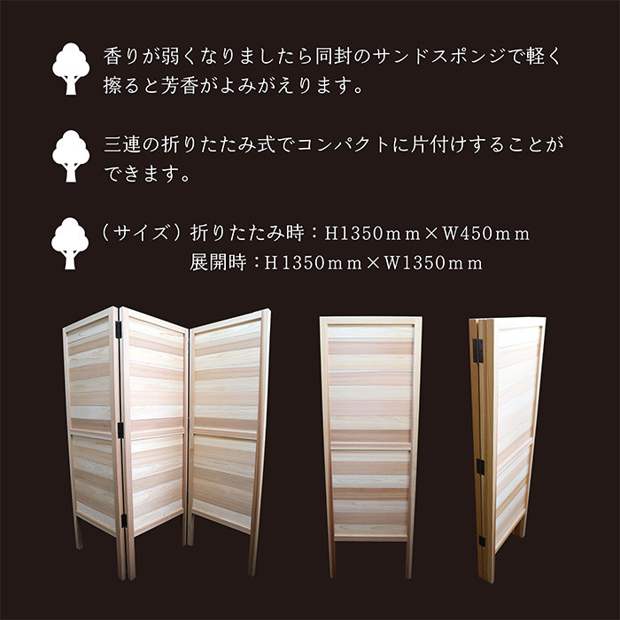 | 容量 | 木製3連パーテーション(※国産無垢材) ※スギ材・ヒノキ材使用 折り畳み時:H1,350mm×W450mm 展開時:H1,350mm×W1,350mm |