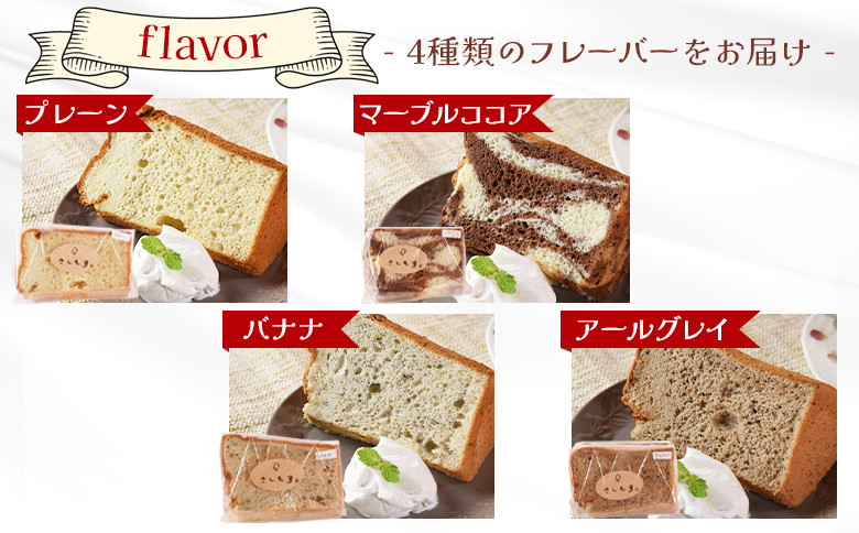 土を耕しひよこを育てる国富町のお菓子屋さんさしもすのシフォンケーキセット <シフォンケーキ4種セット 計8個(4種類×2個)>翌月末迄に順次出荷【 ケーキ 洋菓子 焼き菓子 お菓子 スイーツ セット 自然卵 無農薬 有機栽培 マーブルココア バナナ アールグレイ 】