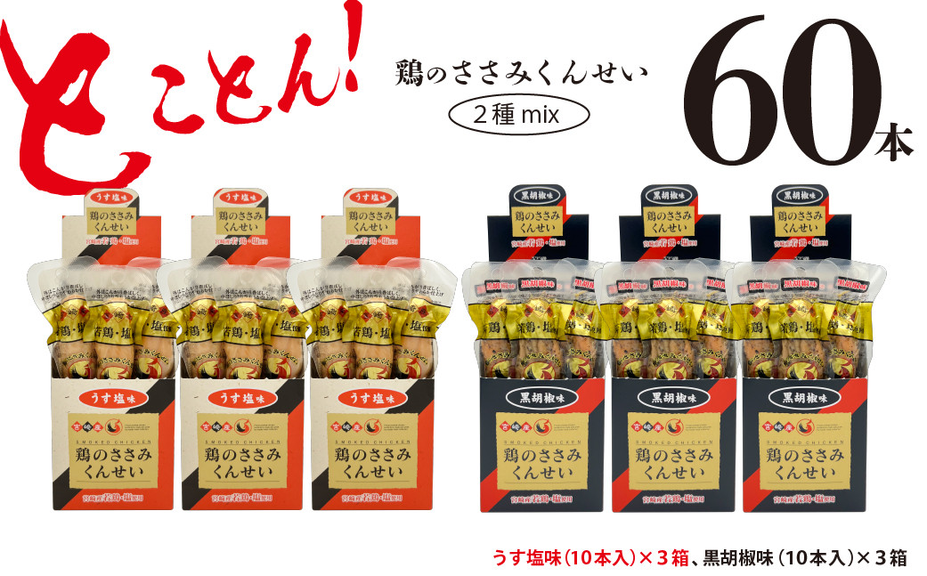 鶏のささみ くんせい 2種 セット 60本 うす塩・黒胡椒 食べ比べ おつまみ スモーク チキン 燻製