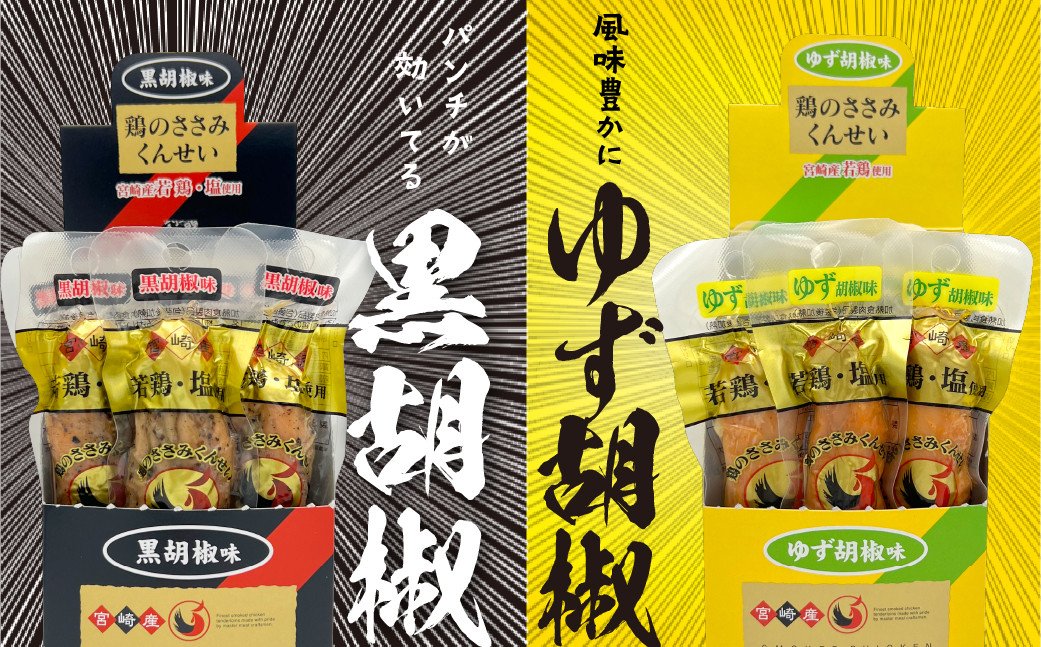 高タンパク質・低脂肪!とことん!鶏のささみくんせい!! お酒のおつまみに最適なスパイシー「黒胡椒味」、柚子の風味漂うピリ辛「柚子胡椒味」の2種セット! お手軽筋肉メシ「鶏のささみくんせい」 おつまみやおやつにおススメ「鶏のささみくんせい」 どど~っんと60本!2種セットでお届けします。 あなたは、黒胡椒派?柚子胡椒派? 昭和57年の創業以来、良質な原料にこだわり、美味しさを追求し続けてきた「鶏のささみくんせい」は、第55回(平成26年度)全国推奨観光土産品審査会」日本商工会議所会頭賞を受賞するなど、その美味しさが全国でも認められています。 燻製一筋30余年。宮崎県産の若鶏ささみと食塩を使用し、長年にわたる燻製技術と造りに関わるノウハウを生かして、手作り主体で丁寧に仕上げた「鶏のささみくんせい」をぜひご賞味ください。 サラダやパスタのアクセント、お酒のおつまみにも最適です。 雲海物産株式会社 TEL:0985-77-1125