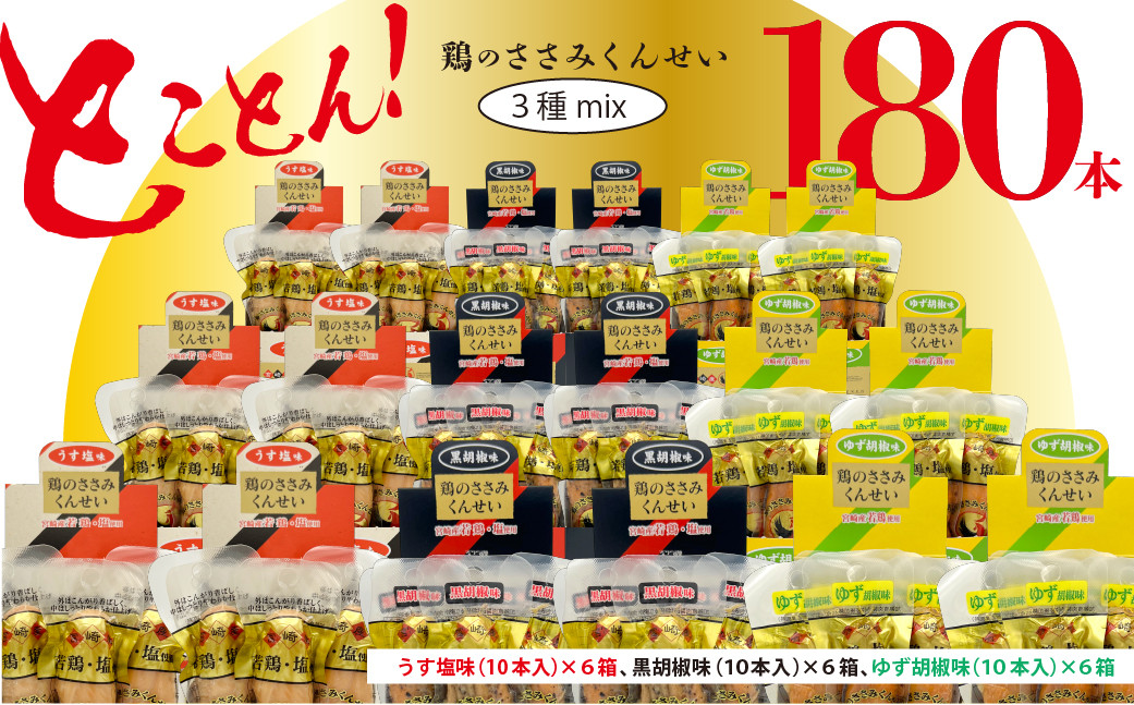 鶏のささみ くんせい 3種 食べ比べ 180本セット [ うす塩 黒胡椒 柚子胡椒 ] おつまみ スモーク チキン 燻製 ささみ燻製 鶏肉 おつまみセット 酒の肴 ビールのおとも 晩酌 家飲み 宅飲み 高たんぱく 低脂肪 ヘルシー おやつ 保存食 常温保存 父の日 敬老の日 贈り物
