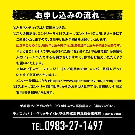 【お申し込みの流れ】 ふるさとチョイスより寄附申し込み。 ご入金確認後、エントリーサイト「スポーツエントリー」のURLをメールにてご連絡いたしますので、参加申し込み手続きをお願いいたします。 出走するためには、寄附申し込み完了後、別途参加申し込み手続きが必要です。 ※ふるさとチョイスで申し込みされた際に発行された「申込番号」は、必要情報入力フォームへ入力する必要がありますので、番号をお控えいただくようお願いいたします。 ※初めて「スポーツエントリー」をご利用の方は、メンバー登録を行っていただく必要がございます。 https://www.sportsentry.ne.jp/register 「スポーツエントリー」専用URLからのお申し込み完了後、事務局より『参加案内』等を郵送いたします。 |