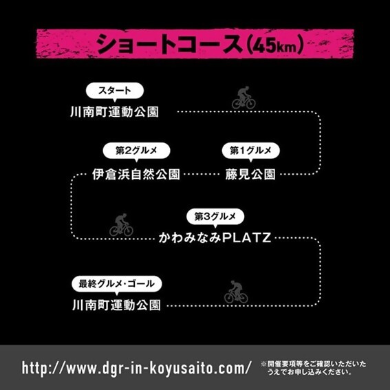 | 容量 | ☆ショートコース(45km) スタート(川南町運動公園)→第1グルメ(藤見公園)→第2グルメ(伊倉浜自然公園)→第3グルメ(かわみなみPLATZ)→最終グルメ・ゴール(川南町運動公園) |