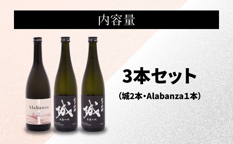 | 容量 | 【純米吟醸「城 ~不落の城」】720ml×2 【スパークリング 「Alabanza」~賛嘆~】720ml×1 ※20歳未満の者の飲酒は法律で禁止されています |