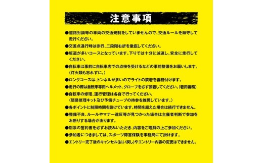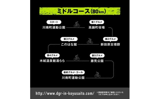 容量 | 出走権(1名様) ☆ロングコース(140km) スタート(川南町運動公園) → 第1グルメ(高鍋町役場) → 第2グルメ(新田原古墳群) → 第3グルメ(このはな館) → 給水ポイント(一ツ瀬ダム展望所) → 第4グルメ(湖の駅) → 給水ポイント(速川神社付近) → 第5グルメ(木城温泉館湯らら) → 第6グルメ(藤見公園) → 最終グルメ・ゴール(川南町運動公園) ※第5グルメのエイドステーションには関門時間が設けられており、木城温泉館湯らら到着が16:00を過ぎますと藤見公園(都農町)へは進めません。ゴール地点へ移動していただきます。 ☆ミドルコース(80km) スタート(川南町運動公園) → 第1グルメ(高鍋町役場) → 第2グルメ(新田原古墳群) → 第3グルメ(このはな館) → 第4グルメ(木城温泉館湯らら) → 第5グルメ(藤見公園) → 最終グルメ・ゴール(川南町運動公園) ☆ショートコース(45km) スタート(川南町運動公園)→第1グルメ(藤見公園)→第2グルメ(伊倉浜自然公園)→第3グルメ(かわみなみPLATZ)→最終グルメ・ゴール(川南町運動公園)) |