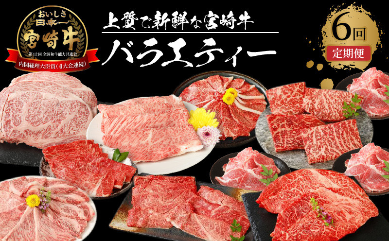 【牛肉 宮崎牛 バラエティー6回定期便 - 国産牛 ブランド牛 ロースステーキ 肩ロース焼肉 肩ローススライス ウデ焼肉 ウデスライス モモステーキ モモスライス ミスジステーキ 宮崎県産和牛 小間切れ 焼き肉用 すき焼き用】
