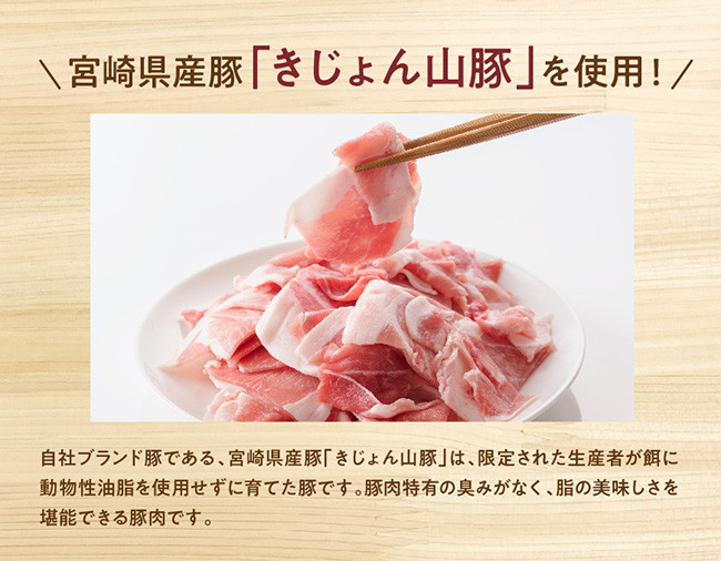 自社ブランド豚である、宮崎県産豚「きじょん山豚」は、限定された生産者が、飼料に植物性たんぱく質を配合し育てた豚なので、豚肉特有の臭みがなく、脂の美味しさを堪能できる豚肉です。