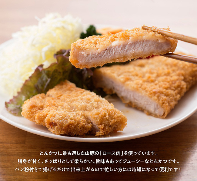 とんかつに最も適した山豚のロース肉を使用し、脂身が甘く、さっぱりとして柔らかい、旨味もあってジューシーなトンカツです。パン粉付きで揚げるだけで出来上がるので、忙しい方には時短になって便利です。