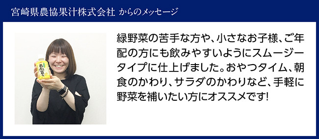 宮崎県産の緑野菜7種(ケール・ほうれん草・キャベツ・レタス・ピーマン・ブロッコリー・セロリ)を使用したスムージータイプの青汁です。数多くあるスムージーの中でも産地をここまで絞った商品は大変珍しく「安心・安全」に飲んでいただける商品となっております。1食分の野菜(117g)を使用していますので、食事の際に1本飲んでいただくのがオススメです。