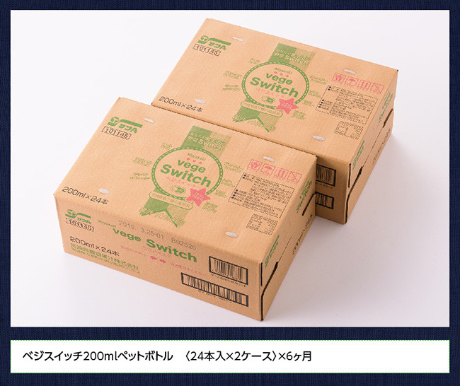 | 容量 | 1回目:ベジスイッチ200mlペットボトル 24本入×2ケース 2回目:ベジスイッチ200mlペットボトル 24本入×2ケース 3回目:ベジスイッチ200mlペットボトル 24本入×2ケース 4回目:ベジスイッチ200mlペットボトル 24本入×2ケース 5回目:ベジスイッチ200mlペットボトル 24本入×2ケース 6回目:ベジスイッチ200mlペットボトル 24本入×2ケース |
