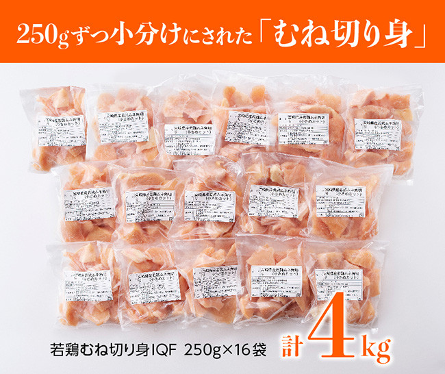 肉 鶏肉 九州産 宮崎県産 若鶏 むね肉 カット済 小分け 便利 満足 大容量 宮崎県産若鶏ムネ切身IQF 4kg (250g×16袋) 肉 鶏 鶏肉