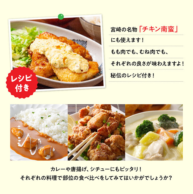 宮崎県内であるあるの、チキン南蛮は、もも派?むね派?論争。秘伝のレシピをお付けしますので、それぞれの部位で調理しお好みの部位を見つけてみてはいかがでしょうか。他にも、唐揚げやカレー・シチューなどにもお使いいただけますので、それぞれの料理で部位の食べ比べをしてみてはいかかでしょうか。【ご入金確認後、翌月より6ヶ月間発送します】