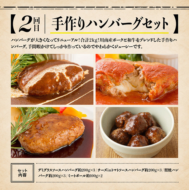 | 容量 | 【1回目~おかず 12種セット~】 デミグラスソースハンバーグ 約200g トマトソースハンバーグ 約200g チキン南蛮 約200g チキンのクリーム煮 約200g チキンときのこのトマト煮 約200g チキンのグリーンカレー 約200g チーズカレードリア 約200g ピリ辛ミートドリア 約200g コーンツナマヨドリア 約200g ハッシュ・ド・ビーフドリア 約200g 濃厚海老マカロニグラタン 約200g ビーフシチュー 約200g 【2回目~手作りハンバーグセット~】 デミグラスソースハンバーグ約200g×3 チーズinトマトソースハンバーグ約200g×3 照焼ハンバーグ約200g×3 ミートボール約100g×2 【3回目~プレミアムセット~】 やわらかスペアリブ…約1kg デミグラスソースハンバーグ…約200g×2 チーズinトマトソースハンバーグ…約200g×2 照り焼きハンバーグ…約200g×2 グリルハンバーグ…約100g×4 チーズカレードリア…約200g×2 ピリ辛ミートドリア…約200g×2 ハッシュ・ド・ビーフドリア…約200g×2 コーンツナマヨドリア…約200g×2 粒マスタード…1本 |