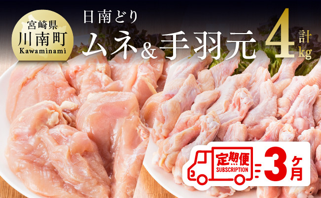【3ヶ月定期便】宮崎県産若鶏 日南どり むね肉&手羽元 計4k…