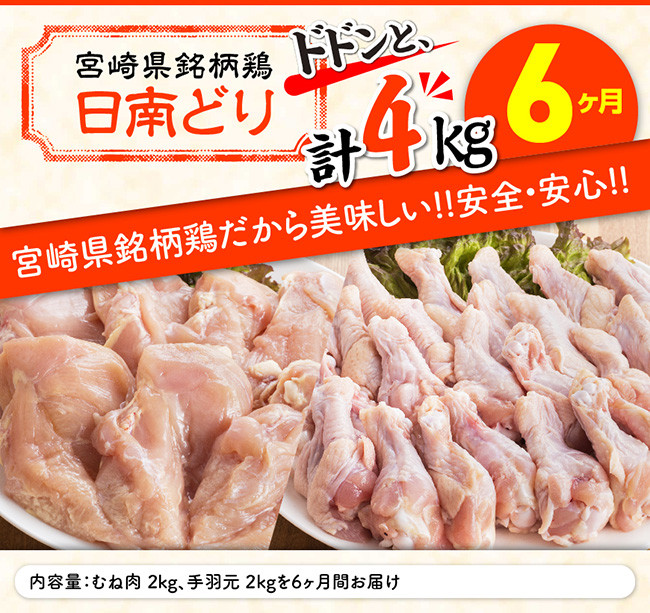 日南どりは、「健康な鶏は美味しい」のコンセプトを基に、飼育された宮崎の銘柄鶏です 【6ヶ月定期便】宮崎県産若鶏 日南どり むね肉&手羽元 計4kg(各2㎏×1) 【 ふるさと納税 鶏肉 鶏 若鶏 むね 手羽元 セット 宮崎県産 川南町 おうち時間 おうちごはん 定期便 送料無料 】