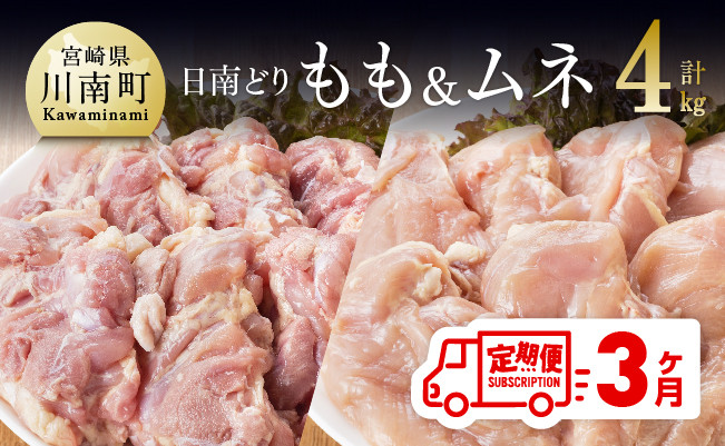 【3ヶ月定期便】宮崎県産若鶏 日南どり もも肉&むね肉 計4k…