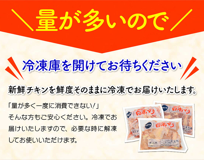 宮崎県産「日南どり」のもも肉、むね肉、手羽元を2kgずつ冷凍パックでお送りします