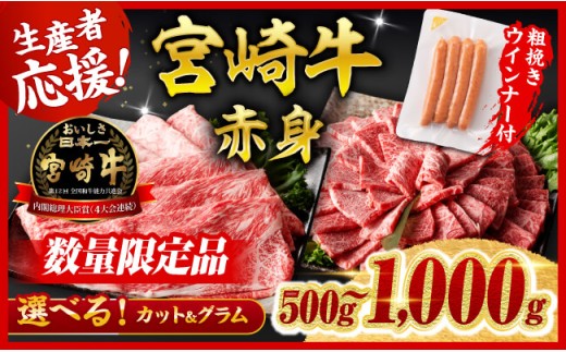 ※発送月・グラム・カットが選べる※ 宮崎牛 赤身(ウデorモモ)すきしゃぶor焼肉500g~1000g+粗挽きウインナー90g 【 牛肉 すき焼き スキヤキ しゃぶしゃぶ スライス 牛 肉 A4ランク 4等級 A5ランク 5等級 】