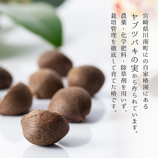 まごえもん「椿油」は、宮崎県川南町の自家椿園のヤブツバキの実から作られています。