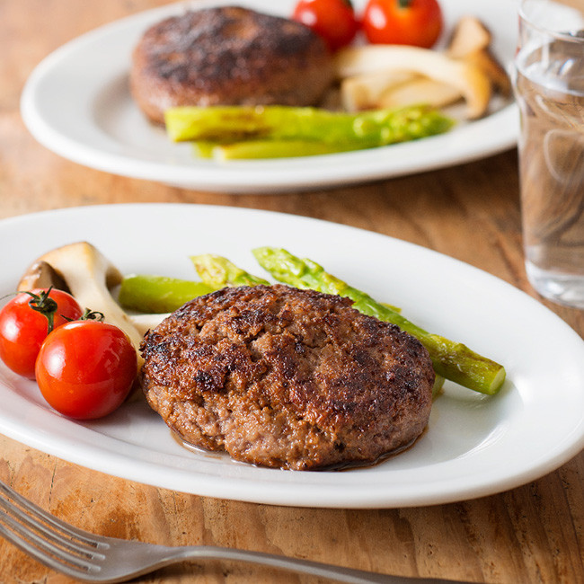 牛肉100%のハンバーグ。赤身肉の味わいを、じっくり噛みしめてください。