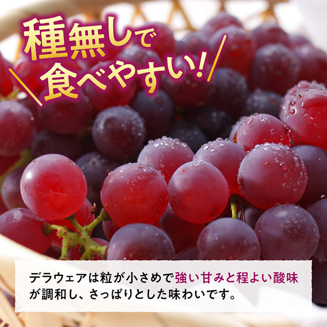 デラウェアは粒は小さめで強い甘みとほどよい酸味が調和し、さっぱりとした味わいです。種無しで食べやすいことが大きな魅力です。
