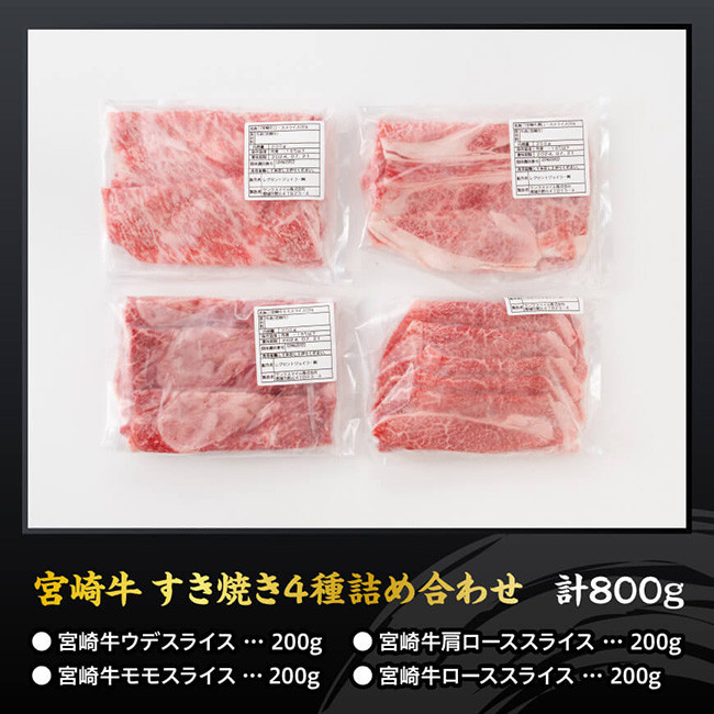 宮崎県が誇る宮崎牛を是非、家族やご友人とお楽しみください。 宮崎牛すき焼き食べ比べ4種盛 合計800g【 肉 牛肉 国産 黒毛和牛 宮崎牛 すき焼き しゃぶしゃぶ 焼きしゃぶ 食べ比べ 宮崎県 川南町 】
