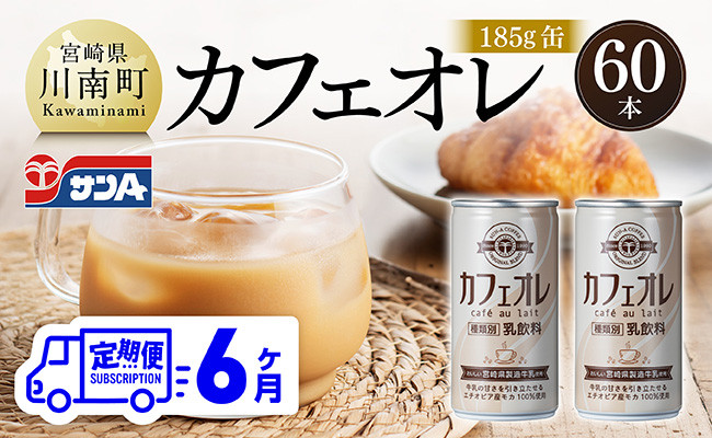 牛乳の甘さを引き立たせるエチオピア産モカを使用しています。 【6ヶ月定期便】サンA カフェオレ 185g 缶 30本 入り ×2ケース 【 飲料 カフェオレ 缶 ジュース 長期保存 九州 宮崎県産 川南町 送料無料 】