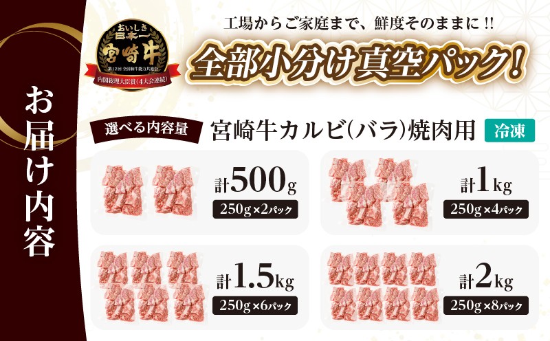 人気 ギフト 食品 お肉 焼き肉 BBQ お土産 贈り物 送料無料 プレゼント 【内容量が選べる】全部小分け真空パック!!「宮崎牛カルビ(バラ)焼肉用」(計500g 1kg 1.5kg 2kg) 肉 牛 牛肉 おかず 国産_T041-0065-SKU-C